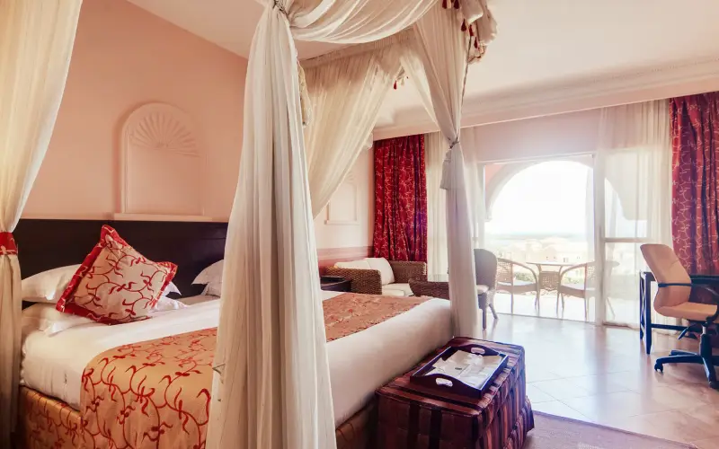 Each room is individually styled, blending warm African textures with classic European touches. Four-poster beds draped in soft mosquito nets, private verandas opening onto lush tropical gardens, and softly lit interiors create an atmosphere of understated sophistication and quiet comfort.