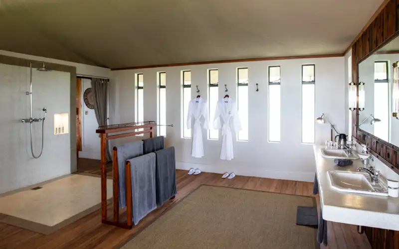 Lodo Springs offers eight guest rooms designed to combine the feel of a traditional safari tent with modern comfort. Each room features large sliding glass doors and windows, polished wooden floors, and quality furnishings to create a comfortable and relaxing environment.