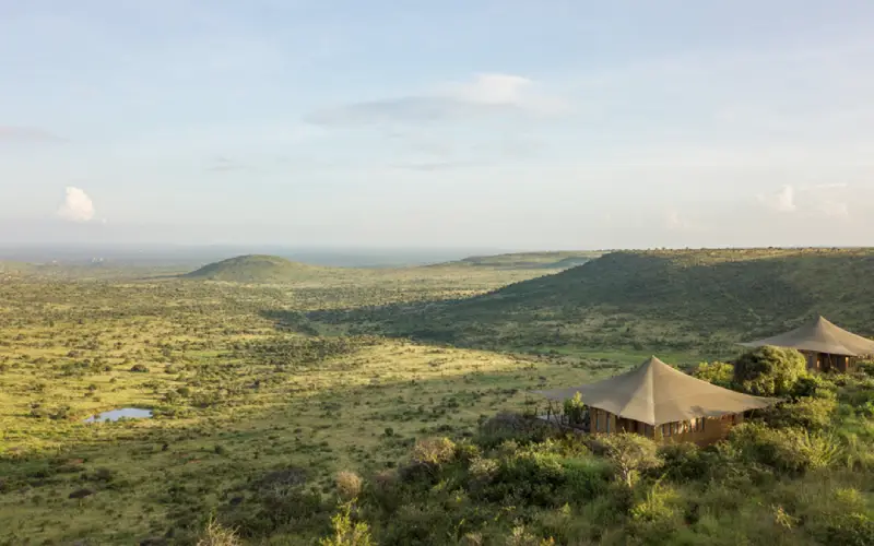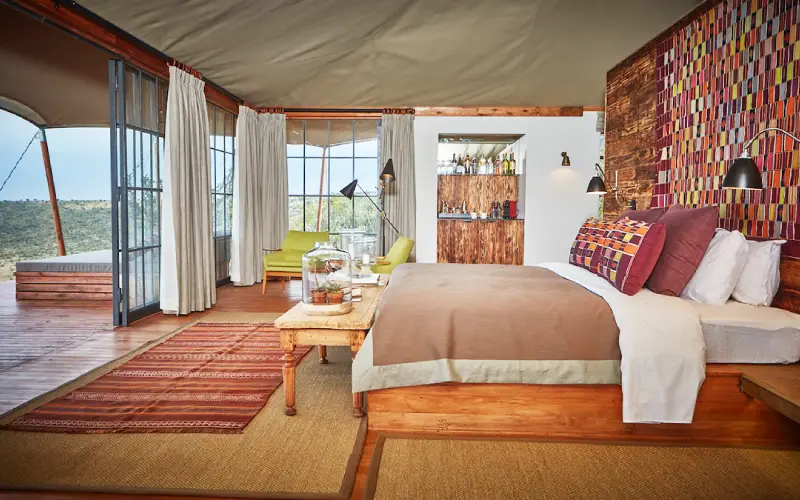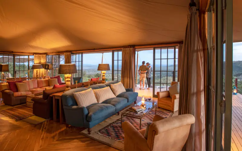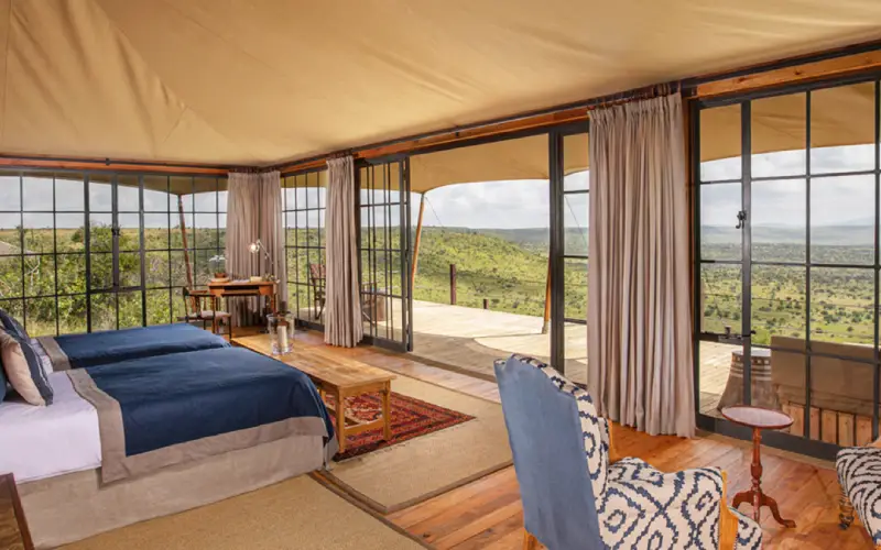 Once the private home of Italian nobleman Count Ancilotto, Loisaba blends historic charm with refined rustic luxury. The tented camp offers twelve spacious tents featuring floor-to-ceiling doors and windows, polished wooden floors, and elegant Africana décor with subtle European influences.