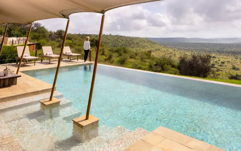 The lodge features just six spacious cottages, comfortably furnished and equipped with modern amenities, including complimentary Wi-Fi. Guests benefit from an exclusive safari experience with access to vast private wilderness. Game drives offer opportunities to see the Big Five—elephants, lions, leopards, buffalo, and rhinos—as well as many other protected species. The reserve is especially renowned for its large and carefully protected population of black rhinos, one of the most significant in Africa.