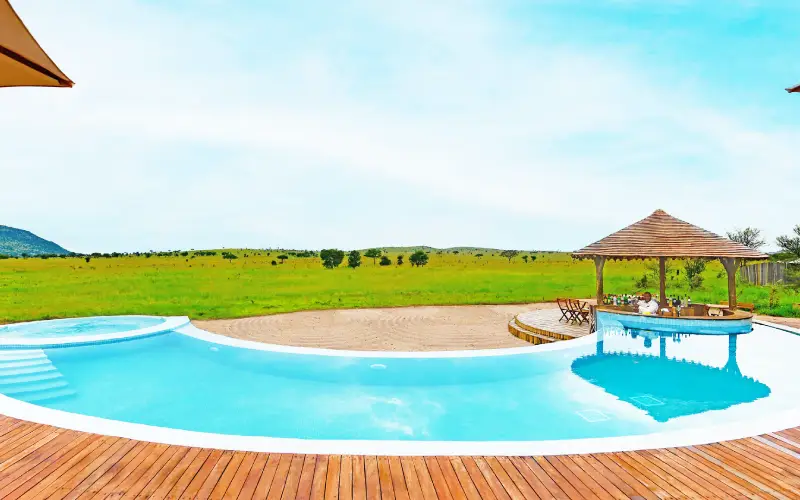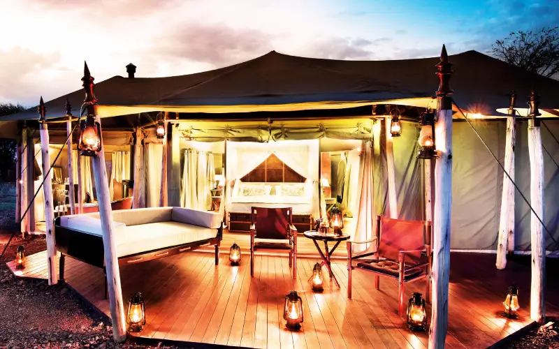 The lodge features well-appointed, spacious tents on raised platforms, providing guests with spectacular views of the surrounding savannah plains and the wildlife that roams freely. Each tent is en-suite with modern facilities, including a flushing toilet and hot and cold running water. The camp also prioritizes sustainability, utilizing a solar power system and locally sourced materials to minimize its environmental footprint.