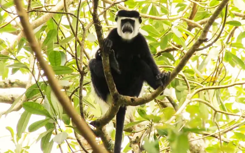 Kibale National Park is one of the few locations where the endangered Ugandan red colobus is found and supports the largest known population of this species. It is also a key habitat for the endemic Uganda mangabey. The forest shelters a variety of elusive mammals, including elephant, buffalo, giant forest hog, warthog, bushpig, bushbuck, blue duiker, and Weyns’s duiker. Leopards are believed to inhabit the area, while lions occasionally wander in from Queen Elizabeth National Park. Smaller, secretive carnivores such as palm civets and African golden cats may also be present within this rich ecosystem.