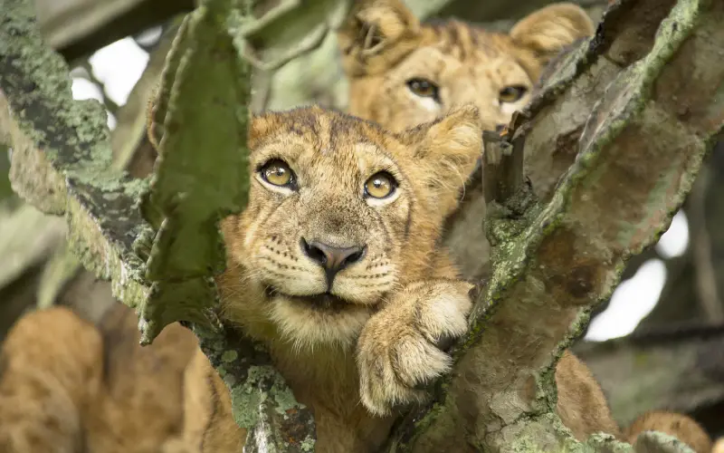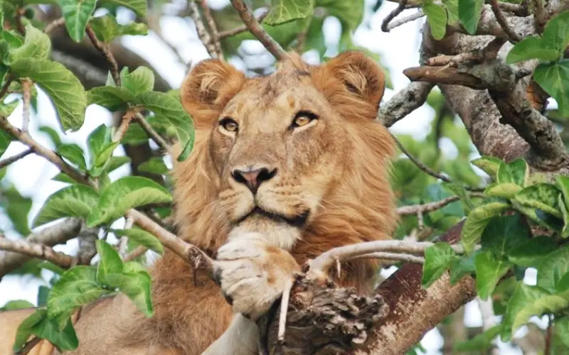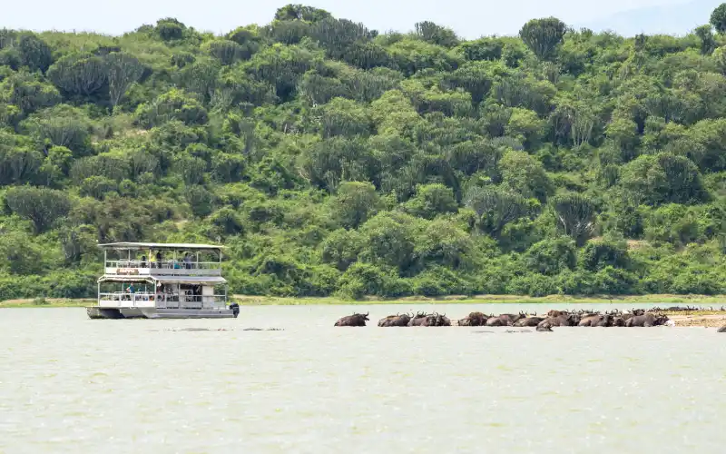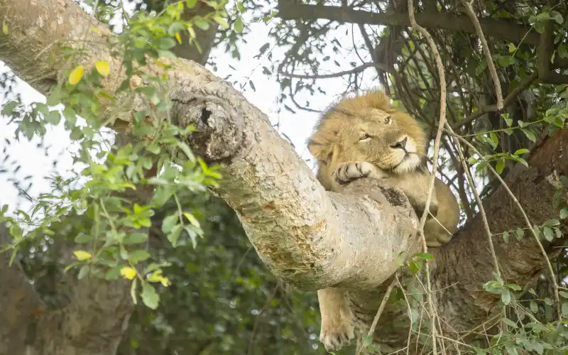 The Ishasha Plains are known for their unique tree-climbing lions, often seen lounging in large fig trees. The rare giant forest hog is frequently spotted around the Kazinga Channel, both on boat safaris and game drives. Buffalo in Queen Elizabeth National Park often appear reddish-brown, a result of interbreeding with forest buffalo from neighboring Democratic Republic of the Congo. Chimpanzee trekking is also available in the humid tropical forest of Kyambura Gorge.