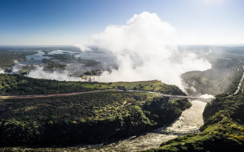 Victoria Falls, also known as Mosi-oa-Tunya, is on the Zambezi River, which borders Zambia and Zimbabwe. It can be viewed from both the Zambian town of Livingstone and the Zimbabwean town of Victoria Falls.
