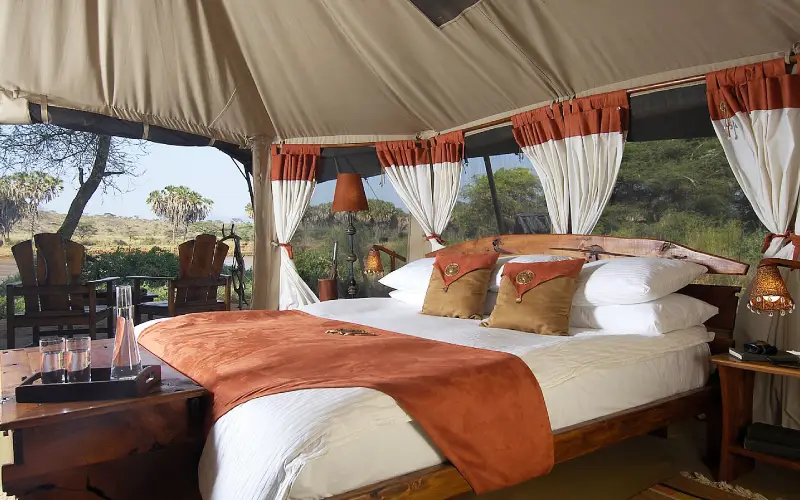 Once the private home of Italian nobleman Count Ancilotto, Loisaba blends historic charm with refined rustic luxury. The tented camp offers twelve spacious tents featuring floor-to-ceiling doors and windows, polished wooden floors, and elegant Africana décor with subtle European influences.
