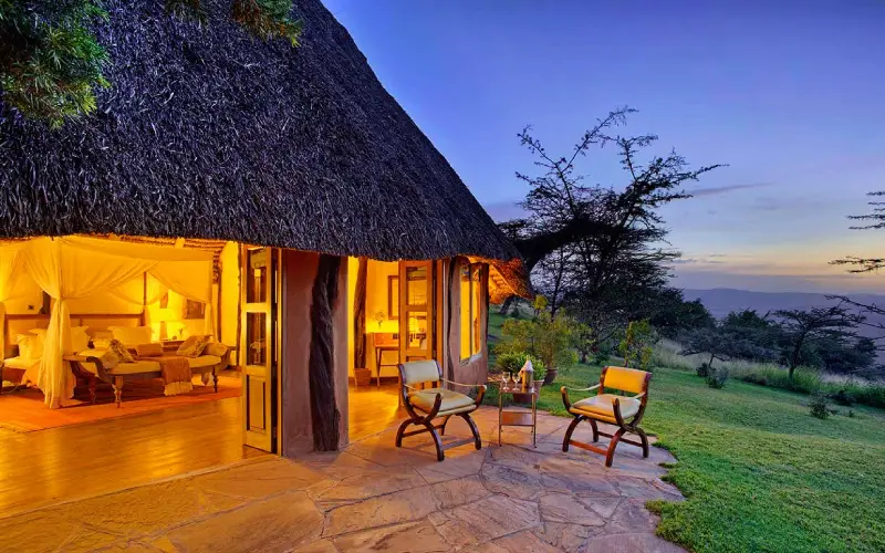Among its most unique experiences are the famous star beds—beautiful four-poster beds set on raised wooden platforms beneath thatched roofs. These can be rolled onto private decks, allowing guests to sleep under Kenya’s vast, star-filled skies. Each retreat is privately positioned in the wilderness and includes dedicated staff, open-air dining, a full bathroom, and sweeping views across 60,000 acres of wildlife-rich landscape.