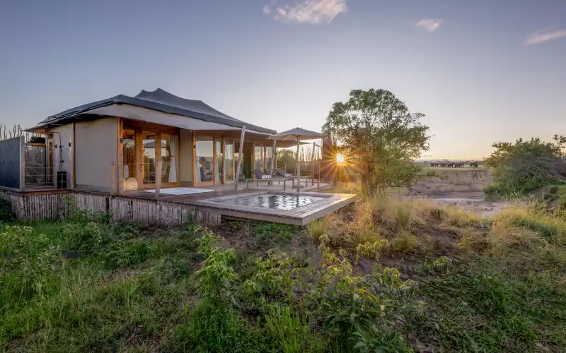 Get ready! We're flying to the Masai Mara Game Reserve in Kenya. When you arrive, Maasai warriors will welcome you. After lunch, you'll have time to relax at the JW Maasai Mara Lodge. You can swim in the infinity pool with amazing views, enjoy a spa treatment, or try delicious food made with local ingredients. Later, we'll go on a game drive. You'll see lions, antelopes, elephants, zebras, and other animals in the wild. We'll come back to the lodge for a quick talk about tomorrow's hot air balloon ride, then have dinner.