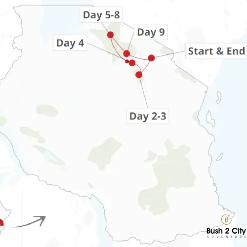 Upon arriving at Kilimanjaro International Airport, you'll be warmly welcomed by your personal Bush 2 City guide, who will escort you directly to your hotel for some relaxation and a chance to soak in the African ambiance. The following day begins your unique, private safari adventure. You'll have the freedom to explore at your leisure in your safari jeep, pausing to observe the wildlife for as long as you wish.